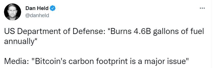 «Министерство обороны США: Сжигает 4,6 млрд галлонов топлива в год. Тем временем в СМИ: углеродный след биткоина стал серьезной проблемой», — иронично отметил директор по развитию бизнеса криптобиржи Kraken Дэн Хелд.
