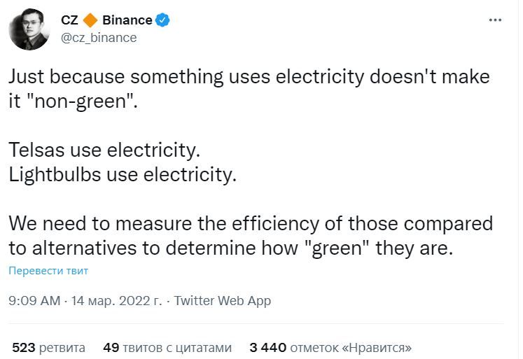 За майнеров поспешил заступиться глава популярной криптобиржи Binance Чанпен Чжао. Он отметил, что использование индустрией электроэнергии не делает ее врагом экологии.