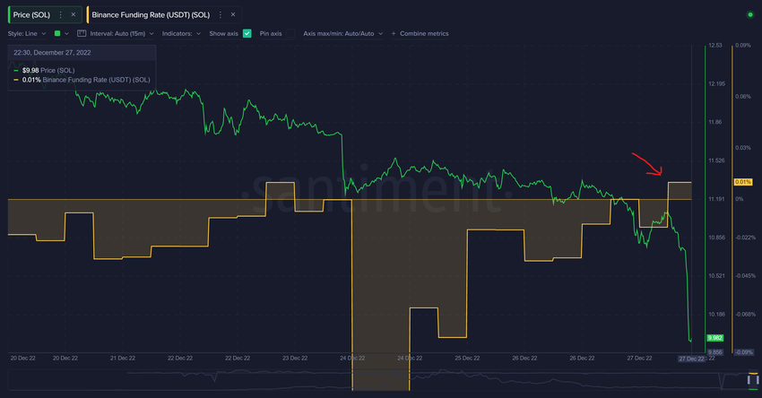 Нативный токен сети Solana (SOL) оказался в немилости у трейдеров из-за разоблачений в СМИ по поводу фейковой активности вокруг экосистемы. К такому выводу пришли исследователи Santiment. Аналитики указали на падение котировок SOL на 8% почти сразу как только ставка финансирования на Binance вышла в плюс.