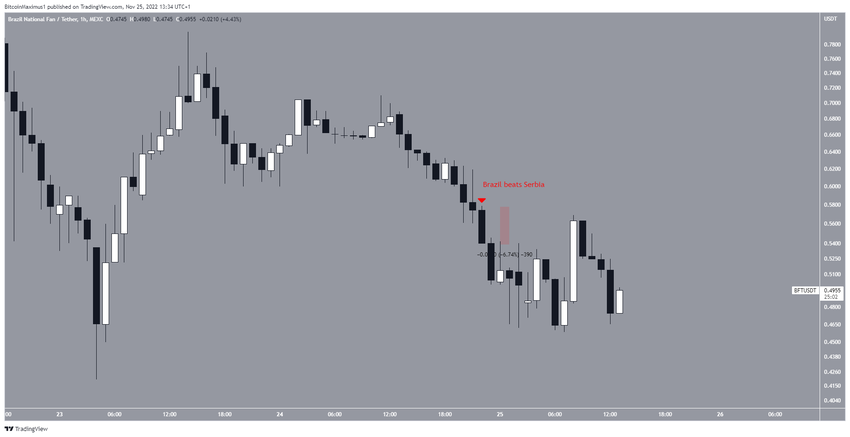 Впрочем, стоит отметить, что хотя 24 ноября бразильская сборная обыграла со счетом 2-0 команду Сербии, курс токена отреагировал на эту победу просадкой почти на 7%.