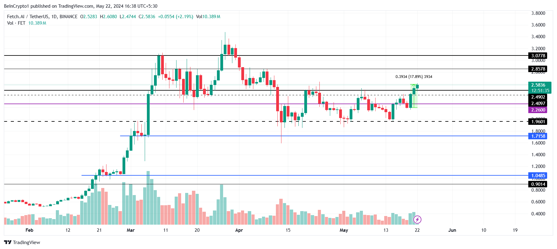 Цена Fetch.ai преодолела сопротивление $2,50 и достигла $2,58, показав почти 18%-ный рост за три дня. Это позволило альткоину выйти из месячной консолидации, но вскоре FET может вернуться в нее.