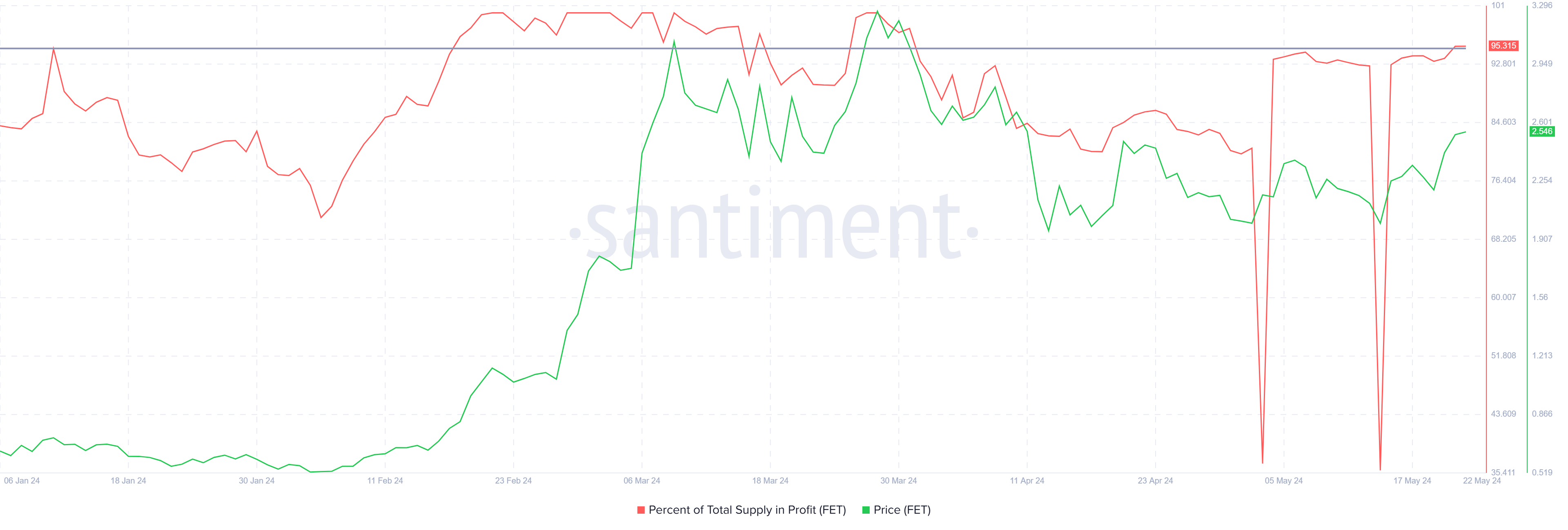 Вершина на рынке формируется, когда ончейн-метрика доли монет в прибыли пересекает порог в 95%. Именно это произошло с FET: сейчас 95,3% от оборотного предложения токенов приносит прибыль. Это чревато распродажей.