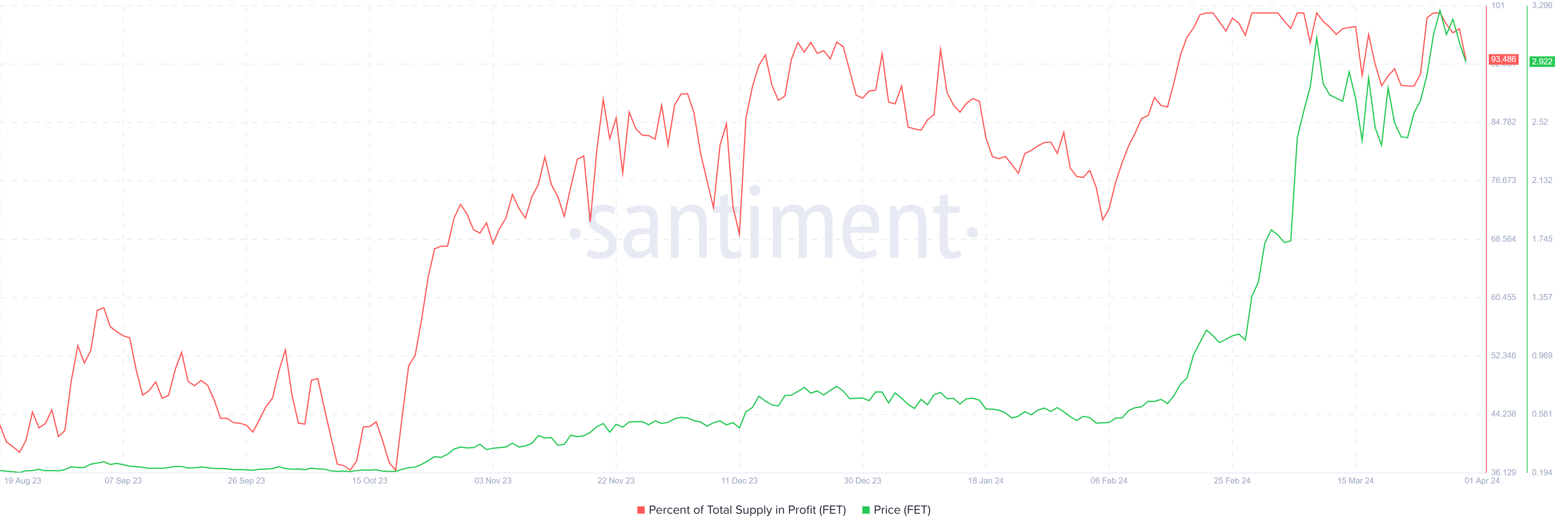 Когда более 95% предложения оказывается прибыльным, актив формирует рыночную вершину, указывающую на возможность разворота или коррекции. На данный момент показатель составляет 93%. Это говорит о том, что FET может ждать дальнейшее снижение.