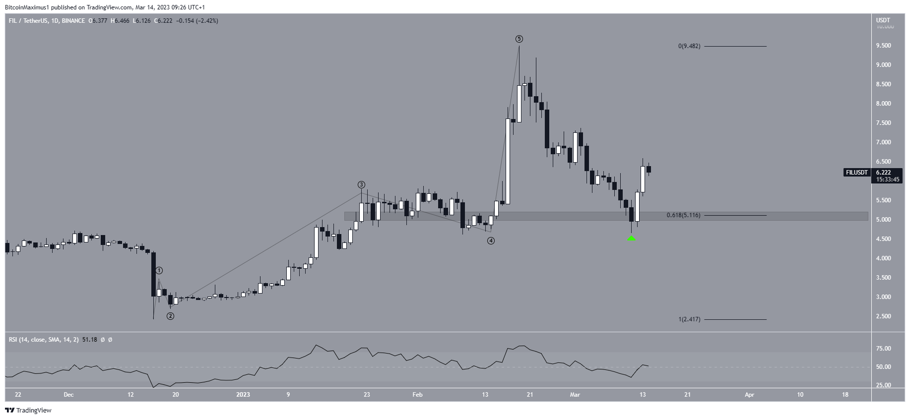FIL – нативный токен проекта Filecoin, который предлагает услуги децентрализованного хранения данных. В марте 2021 года его цена достигла исторического максимума в $237,73. Затем она упала ниже долгосрочной нисходящей линии сопротивления, что привело ее к минимуму в $2,37 в декабре 2022 года. После этого FIL начал бычий разворот, который продолжается до сих пор.