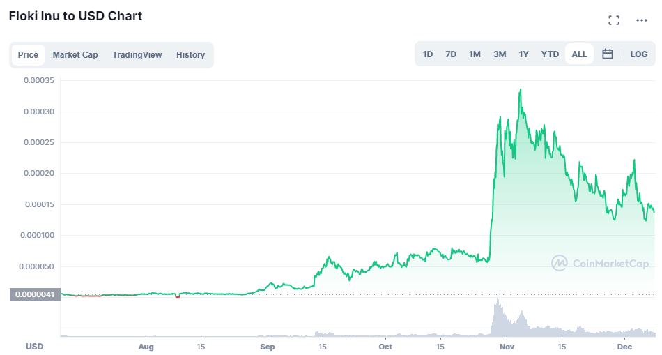 Более того, достигнув максимума пампа в апреле этого года, теперь цена альткоина преимущественно находится в нисходящем тренде, согласно CoinMarketCap. На момент написания статьи цена FLOKI находится в минусе на 60% от исторического максимума.