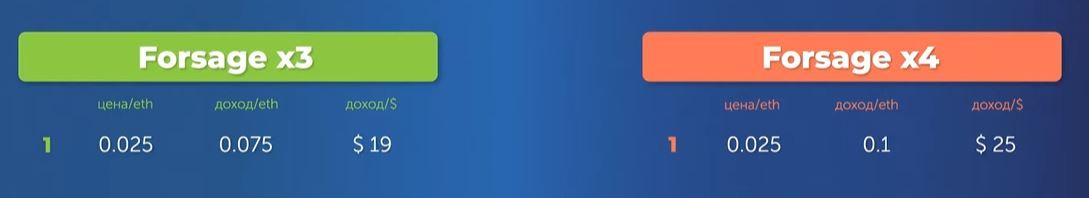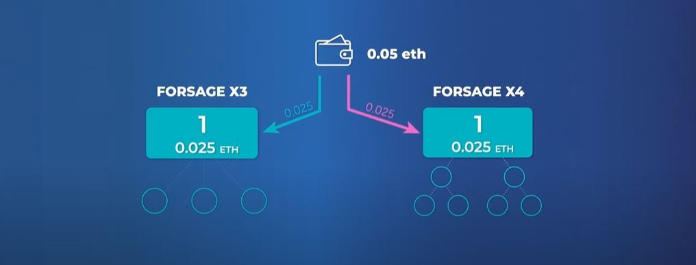 При входе в проект, инвестор получает доступ сразу к двум инвестиционным программам: X3 и X4. В рамках FORSAGE их также называют площадками. Стоимость допуска – 0,05 ETH. За эту сумму инвестор открывает два пути развития реферальной программы.