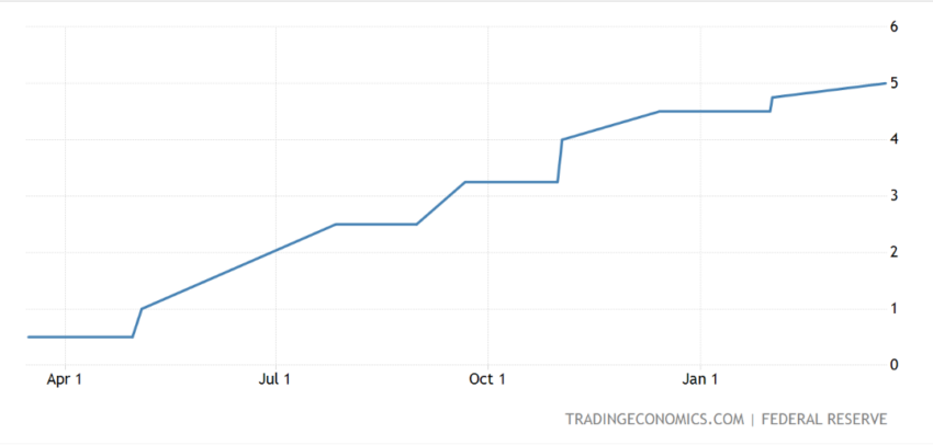 Федеральная резервная система США повысила ставку по федеральным фондам на 25 базисных пунктов до 4,75-5% годовых. Согласно заявлению председателя ФРС Джерома Пауэлла, инфляция в Америке остается повышенной и дополнительное ужесточение денежно-кредитной политики будет уместным.