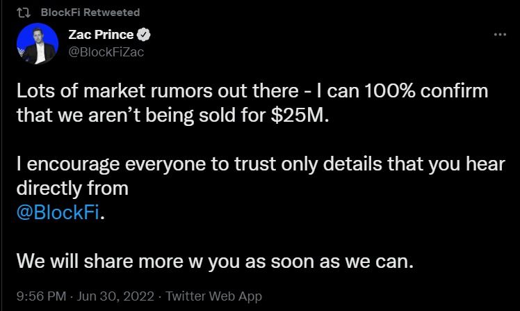 Соучредитель BlockFi Зак Принс у себя в Твиттере назвал «слухами» сообщения о продаже BlockFi за $25 млн. При этом сообщения о поглощении Принс отрицать не стал.