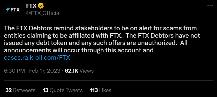 Юридическая фирма Kroll, представляющая интересы обанкротившейся площадки FTX, призвала пользователей избегать токенов, которые позиционируют себя как связанные с криптобиржей. Об этом сообщается на твиттер-странице биржи. В сообщении утверждается, что никто от лица криптобиржи не выпускал никаких долговых токенов, и «любые такие предложения являются несанкционированными».