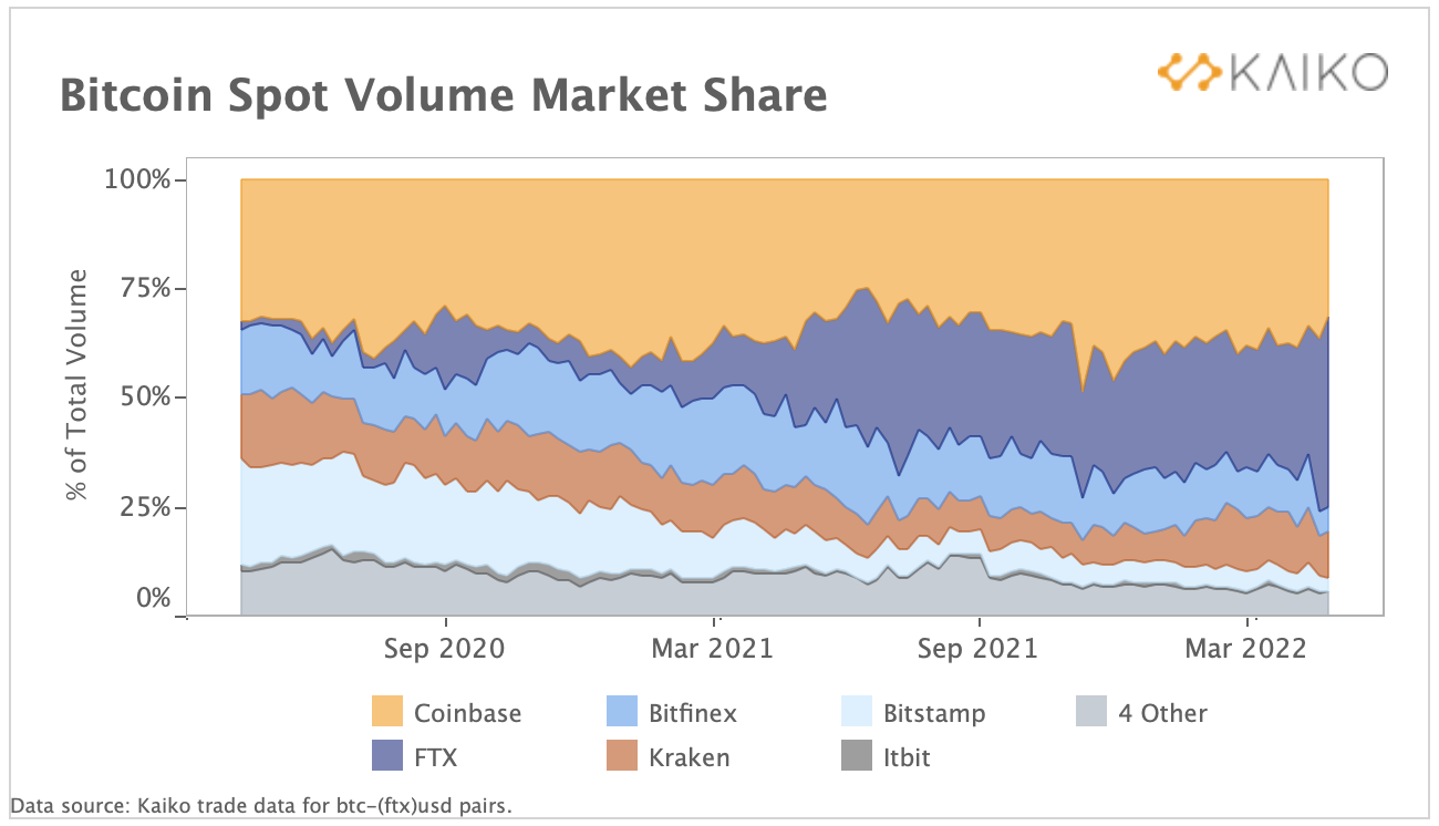 Криптовалютная биржа FTX по итогам мая впервые обошла Coinbase по объемам торгов. Об этом в рассылке сообщили аналитики Kaiko. На графике ниже видна рыночная доля торговых пар с биткоином на десяти основных биржах.