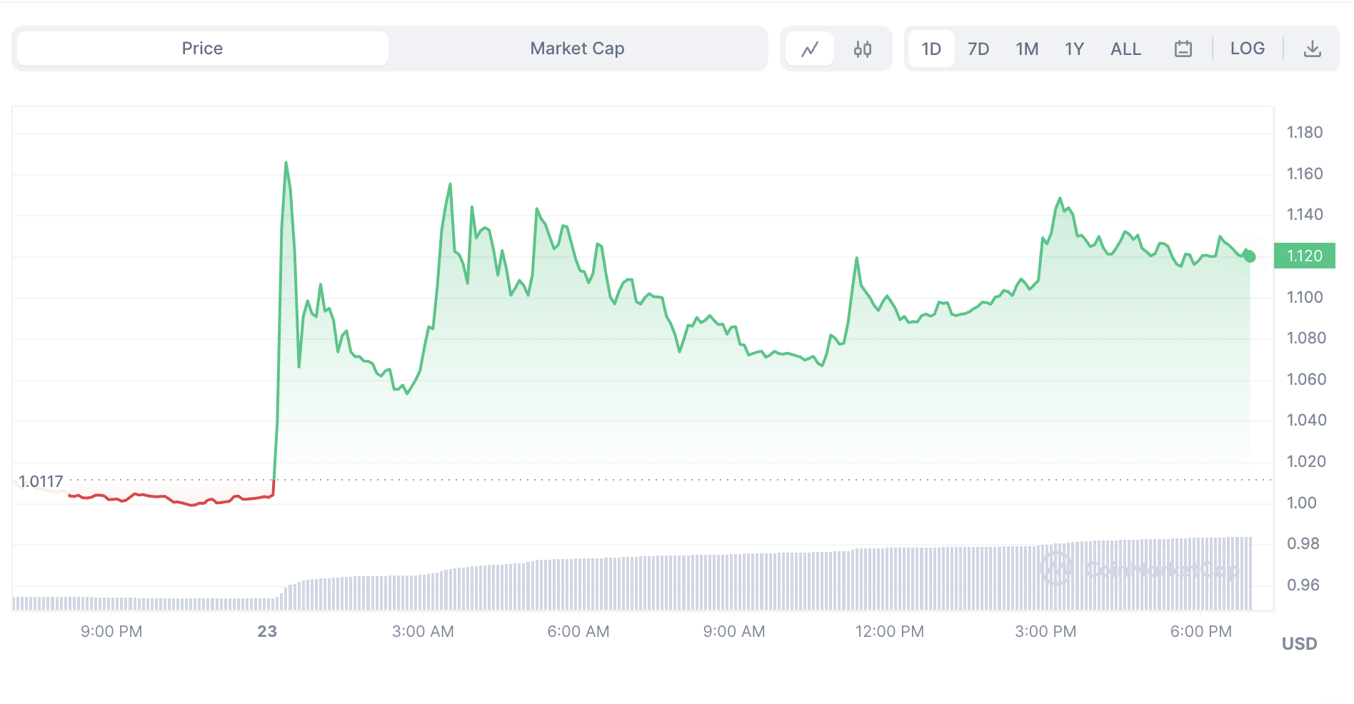 Слухи о перезапуске FTX также привели к росту цены нативного токена платформы FTT. На момент написания материала цена монеты демонстрировала суточный рост на 11,3% – до $1 1221. В пике цена подскочила на 13%, до $1 1661.