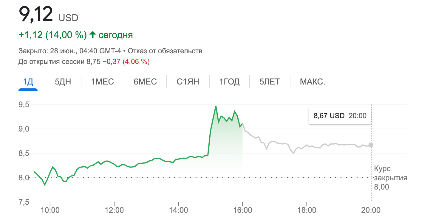 Эта новость спровоцировала рост акций Robinhood. За несколько часов они взлетели на 14%. На момент публикации ценные бумаги торгуются на уровне $9,12. Очевидно, что инвесторы надеются на некую форму коллаборации между криптобиржей и брокером.