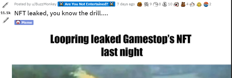 SponsoredКапитализация компании выросла до $16,7 млрд. Рост ценовой активности совпадает с бурными обсуждениями на Reddit по поводу возможного запуска проекта вокруг невзаимозаменяемых токенов (NFT) от GameStop. Например, мем о возможном запуске нового продукта уже набрал более 11 000 апвоутов и свыше 200 комментариев.