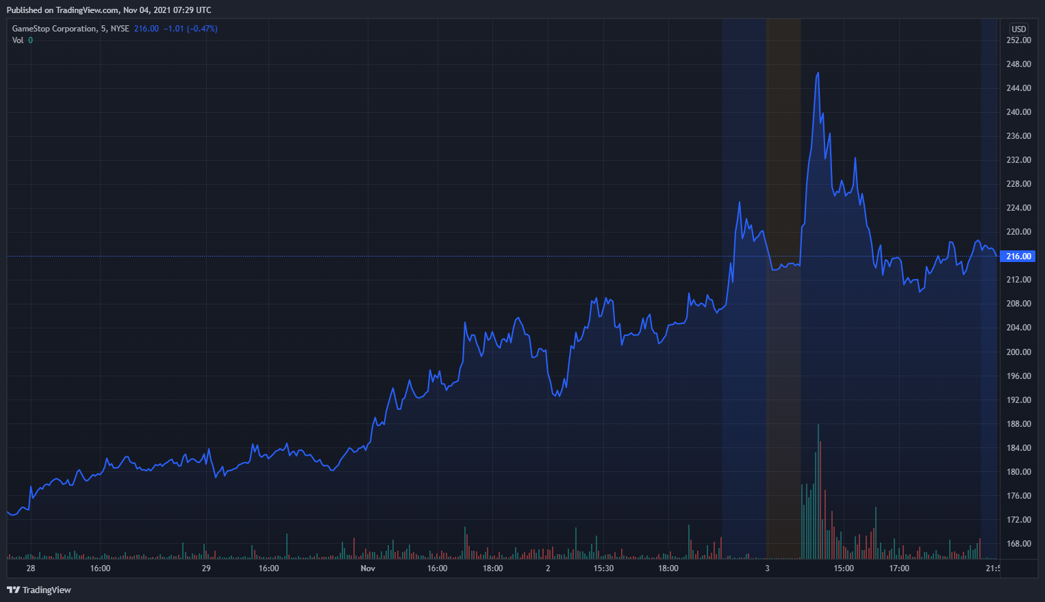 Акции розничной сети по продаже игровых приставок и видеоигр GameStop взлетели более чем на 25%. На момент написания материала цена одной акции GME составляет ~$218. Это почти на 25% больше, чем 1 ноября.