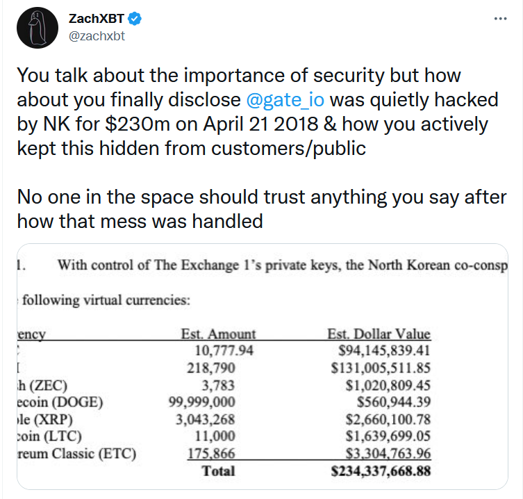 Так, редакция BeInCrypto уже рассказала о том, что 15 ноября в сети появилась ончейн-статистика, указывающая на то, что еще в 2018 году Gate.io могла стать жертвой хакерской атаки и потерять свыше $230 млн. При этом биржа предпочла замолчать данный инцидент. Как прокомментировал пользователь под ником @zachxbt, «вы говорите о важности безопасности … но вы активно скрывали этот факт от пользователей/общественности. После такого никто не должен верить ни слову из того, что вы говорите».