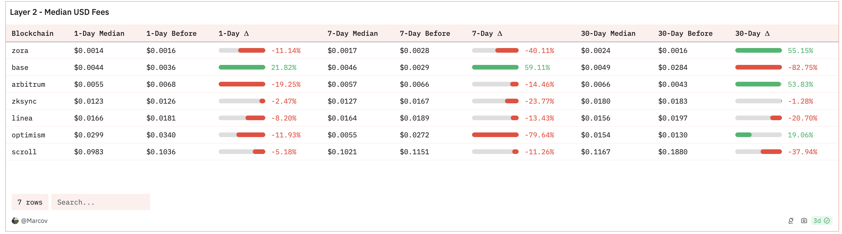 Как видно на дашборде Dune от @Marcov, за прошедшие семь дней сильнее всего комиссии упали в блокчейне Optimism — 79%. В сети Zora издержки обвалились на 40%, а в самом популярном L2-решении на Ethereum — Arbitrum — цены на газ снизились на 14%.