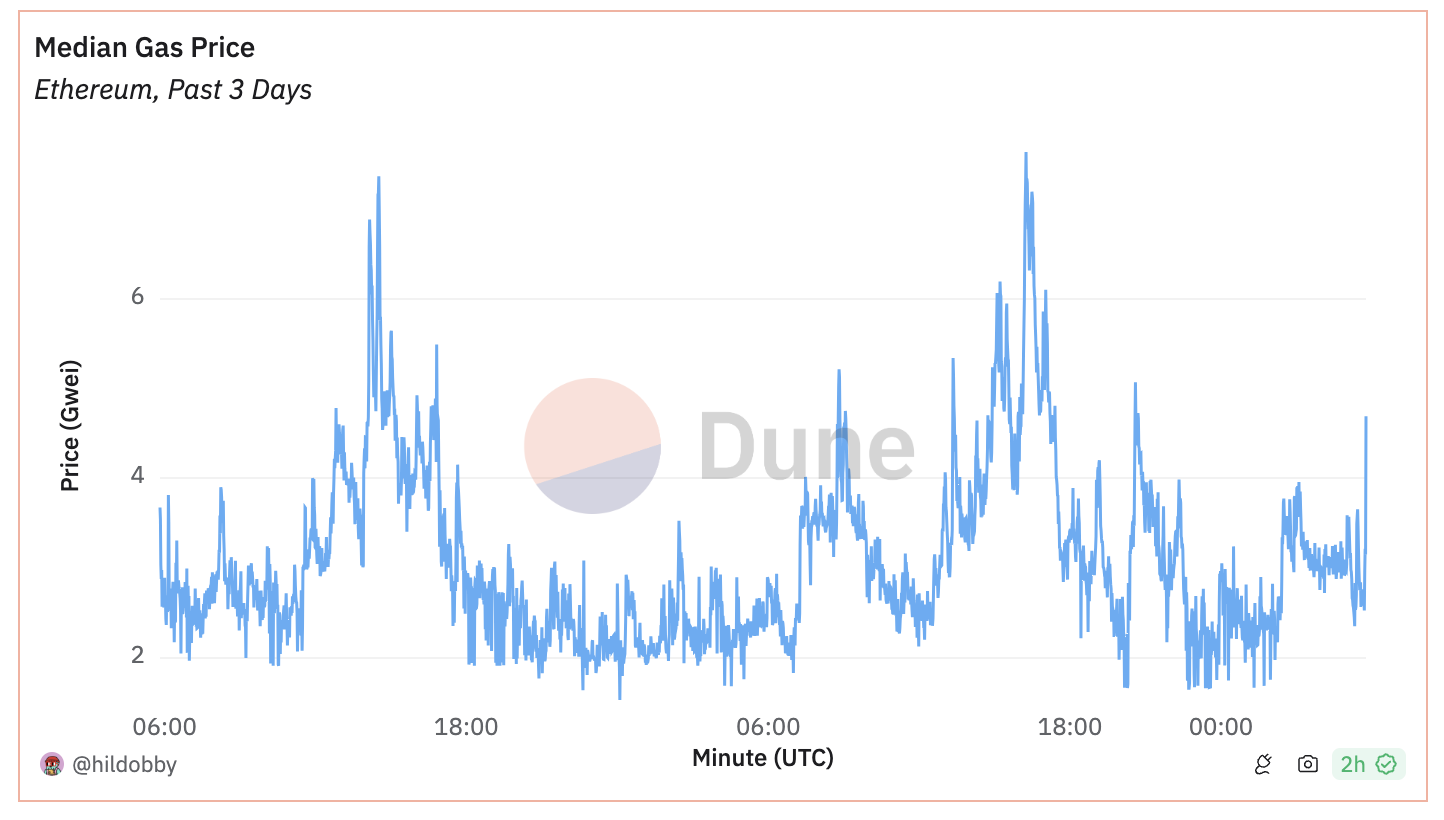 По данным Dune, в настоящее время средняя цена на газ в сети Ethereum составляет 2,6 gwei.