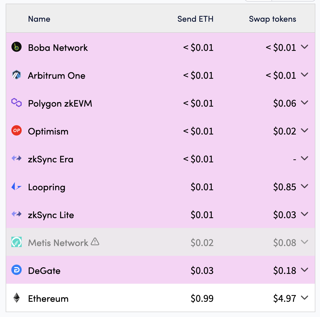 Цены на газ в L2-решениях опустились не сразу, но все последние месяцы стабильно падали. Согласно L2Fees, почти во всех сетях второго уровня показатель составляет менее $0,01.