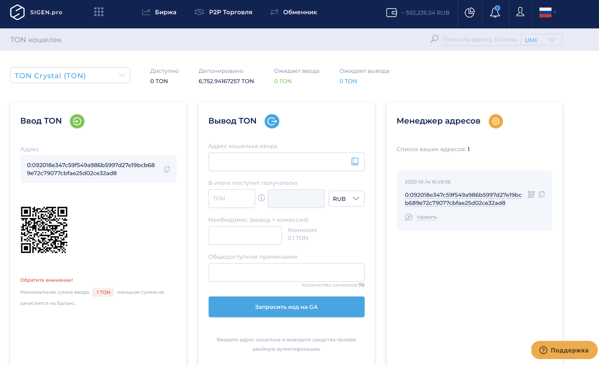 Перед началом пользования кошельком нужно сгенерировать собственный уникальный адрес, который в дальнейшем навсегда закрепляется за клиентом. После этого становится доступным ввод TON Crystal. Вывод монет в целях безопасности возможен только после того, как вы пройдете двухфакторную аутентификацию. Процедуру KYC проходить не нужно, так как с фиатными счетами напрямую платформа не работает.