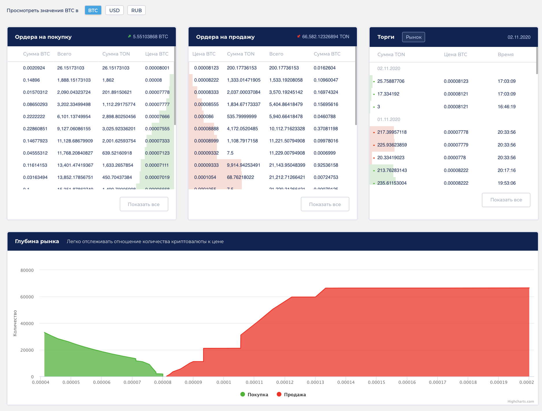 Интерфейс биржи: купить TON, продать TON