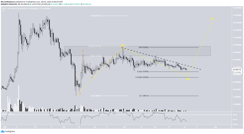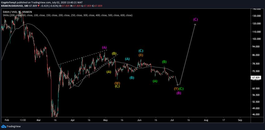Криптовалютный трейдер @Glow1994 отмечает присутствие волновой структуры на графиках DASH, в которой цена должна упасть к отметке $60 прежде чем поднимется до $130.