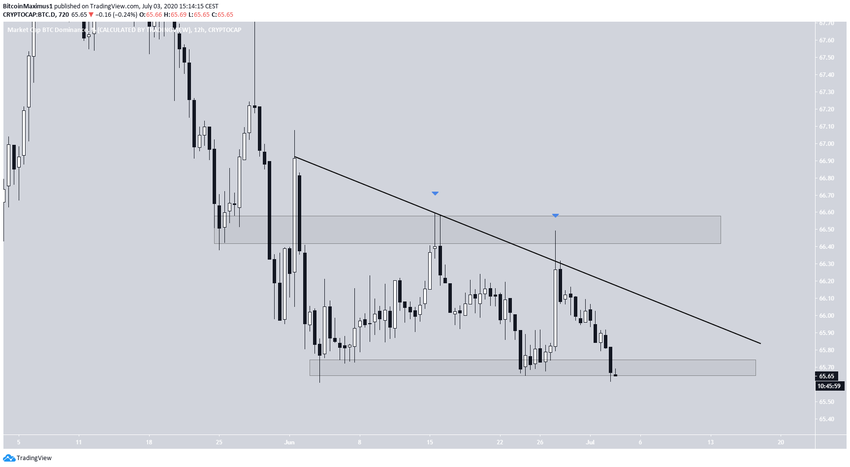 О потенциале роста альткоинов в паре с биткоином говорит уровень доминирования BTC, показанный на графике ниже.
