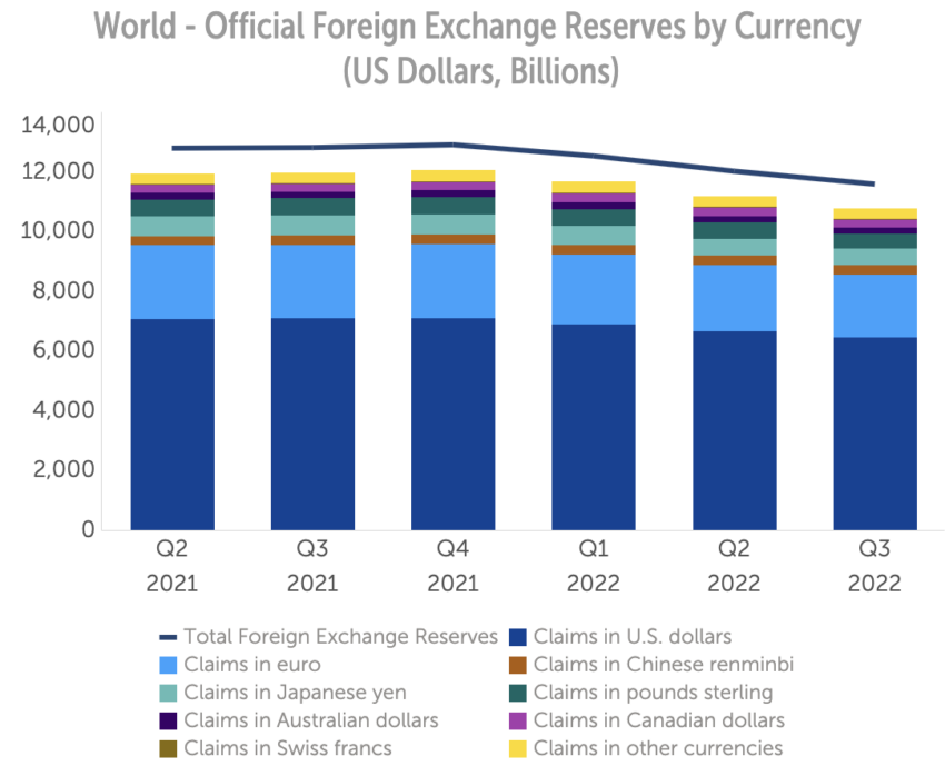 Несмотря на сохраняющееся доминирование доллара США, его доля в составе резервов мировых Центробанков продолжает неуклонно снижаться. Если два десятилетия назад этот показатель составлял около 70%, то сейчас он просел ниже 60%, и эта тенденция сохраняется.