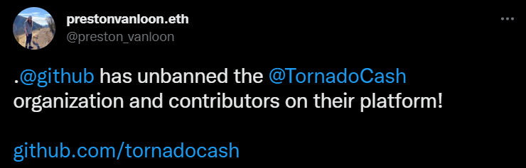 Площадка для хранения IT-проектов GitHub разблокировала аккаунт криптовалютного подсанкционного миксера Tornado Cash. Об этом в твиттере сообщил Ethereum-разработчик Престон ван Лун.