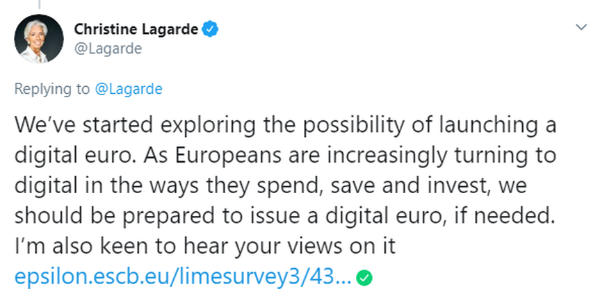 В воскресенье 1 ноября руководитель ЕЦБ Кристин Лагард сообщила в своем официальном аккаунте в Twitter, что монетарные власти еврозоны «изучают возможности запуска цифрового евро». В этой связи она официально вынесла на общественное обсуждение проект цифровой валюты Центробанка (CBDC) и пригласила всех желающих принять в нем участие.