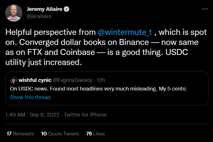 Решение криптовалютной биржи Binance в одностороннем порядке конвертировать USDC на свой стейблкоин binance USD (BUSD) хорошо скажется на USDC. Такого мнения придерживается глава компании Circle Джереми Аллер, эмитента USDC.