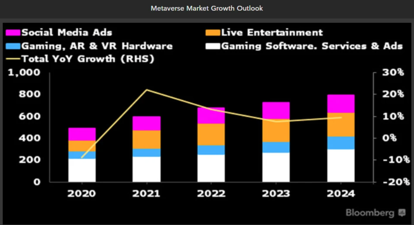 Индустрия метавселенных сейчас — гигантский магнит для денег. Инвестиции льются в отрасль непрерывным потоком, и этот процесс все еще набирает силу. По данным Bloomberg Intelligence, объем рынка будет расти примерно на 13% в год и к 2024 году приблизится к $800 млрд.