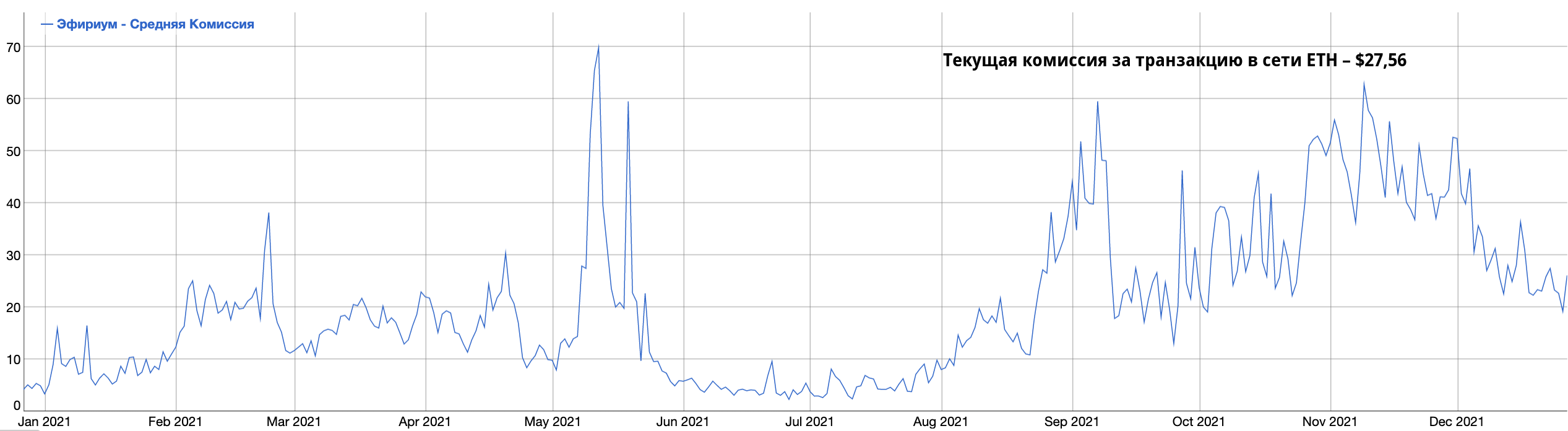 По данным аналитического ресурса CoinMetrics, на конец сентября NFT генерировали 16% всей сетевой активности на блокчейне Ethereum, что стало главной причиной роста сетевых комиссий. По данным Bitinfocharts, сейчас за транзакцию в сети приходится платить более $27, однако в мае она достигала $70.
