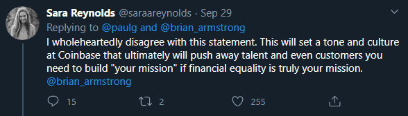 Соучредитель блокчейн-компании she256 Сара Рейнольдс считает, что выбранный Армстронгом путь «задаст тон и культуру Coinbase, которые в конечном итоге оттолкнут таланты и даже клиентов, необходимых для реализации “миссии компании”».