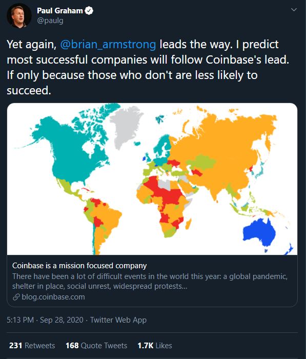 Американский предприниматель Пол Грэм поддержал Армстронга и написал у себя в странице в Twitter, что «большинство успешных компаний последуют примеру Coinbase. Хотя бы потому, что у тех, кто этого не делает, меньше шансов на успех».