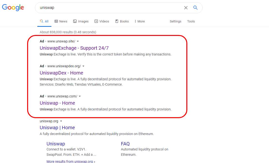 На момент написания материала при поисковом запросе «uniswap» Google действительно выводит в топ сразу несколько ссылок на мошеннические сайты с доменами: unswap.site, uniswapdex.org, unıswap.com.