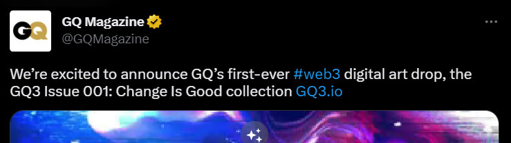 Ежемесячное издание о моде GQ выпустит собственную коллекцию NFT-токенов под названием «GQ3 Issue 001: Change Is Good». Об этом издание сообщило у себя в «Твиттере». Согласно описанию инициативы, коллекция будет состоять из 1661 уникальной цифровой карточки, которую создали цифровые художники Чак Андерсон, REO, Келси Низиолек и Серва Аттафуа.