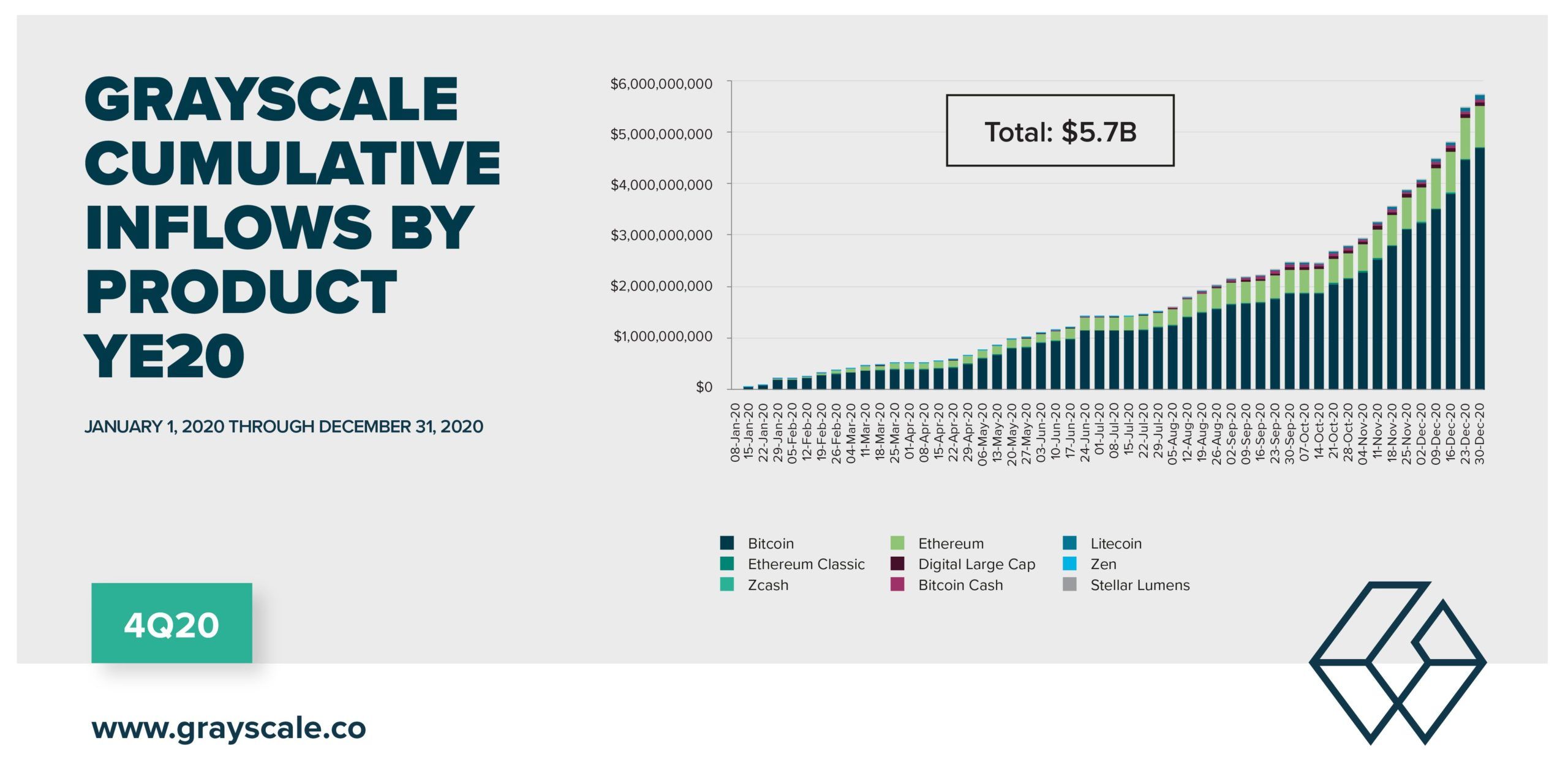 Отметим, что в 2020 году компания Grayscale привлекла инвестиций на сумму $5,7 млрд, из которых $3,3 млрд были привлечены в четвертом квартале 2020 года.