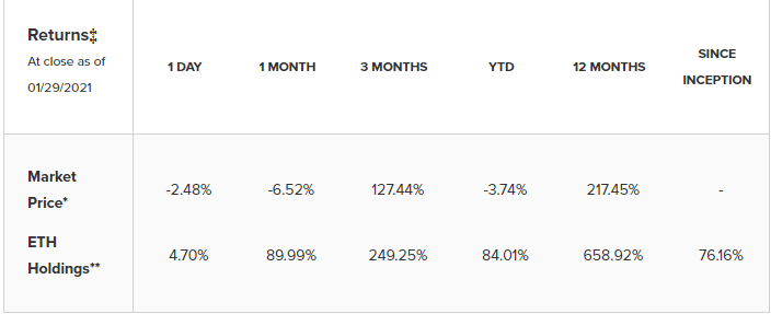 В пятницу, 29 января, рыночная стоимость акций составляла $14,92 на момент открытия и $14,04 на момент закрытия торгов. Годовая доходность инвестиций в акции траста ЕТН за год превысила 217%.