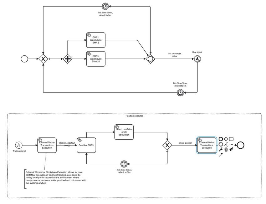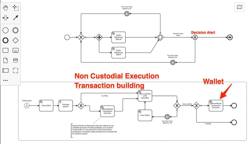 Что и привело нас в конечном итоге к созданию GURU Network — сети, основными компонентами которой являются ноды координации и калькуляции процессов, которые разрабатываются комьюнити и пользователями в виде подобных схемок (bpmn standard для бизнес-автоматизации):