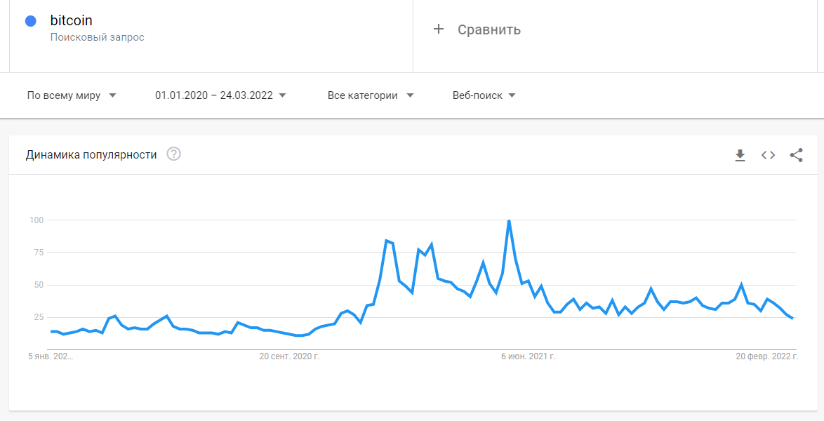 SponsoredВ то время биткоин как раз обвалился с ~$60 000 до ~$34 000. С тех пор интерес к BTC до прежних значений так и не поднимался даже несмотря на то, что в сентябре 2021 года биткоин обновил исторический максимум. Тогда ведущая по капитализации криптовалюта приблизилась к значению в $70 000.