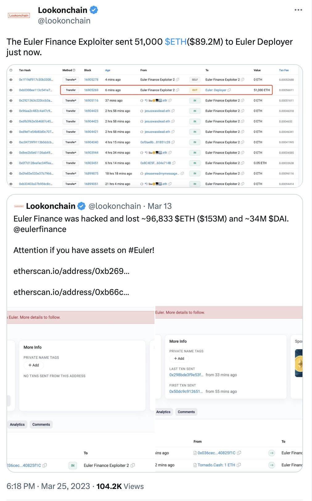 За несколько дней до этого взломщик связался с командой проекта с помощью блокчейн-сообщения. Он заявил, что не намерен удерживать то, что ему не принадлежит, и готов к переговорам. Разработчики Euler Labs пока никак не прокомментировали возврат средств.