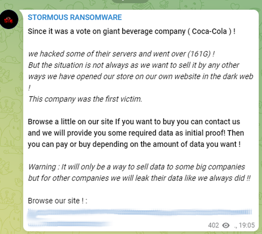 Хакерская группировка Stormous украла 161 Гб данных компании Coca-Cola и продает их за криптовалюту. Об этом пишет BleepingComputer со ссылкой на сообщение хакеров в сети, а также комментарии от самой Coca-Cola. Сообщается, что злоумышленники просят за массив данных 1,65 BTC (~$65 600).