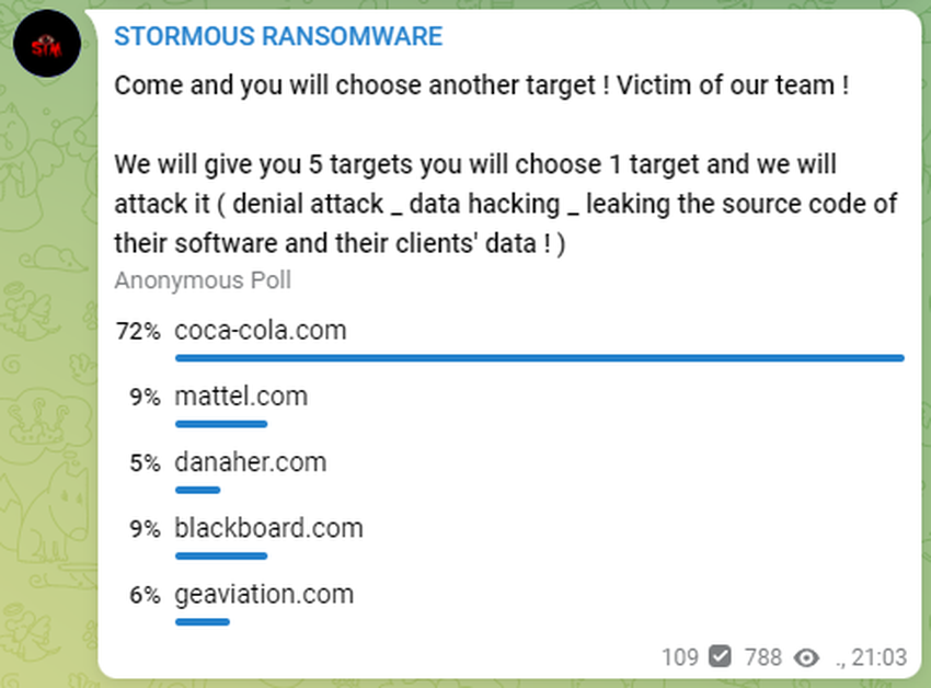 Еще до взлома Coca-Cola, группировка предлагала пользователям выбрать жертву для атаки. Как пишет издание, предложенные варианты демонстрировали антизападную позицию Stormous. Сообщается, что группировка также украла 200 Гб данных у Epic Games. Впрочем, до сих пор нет никаких достоверных данных для подтверждения этой информации.