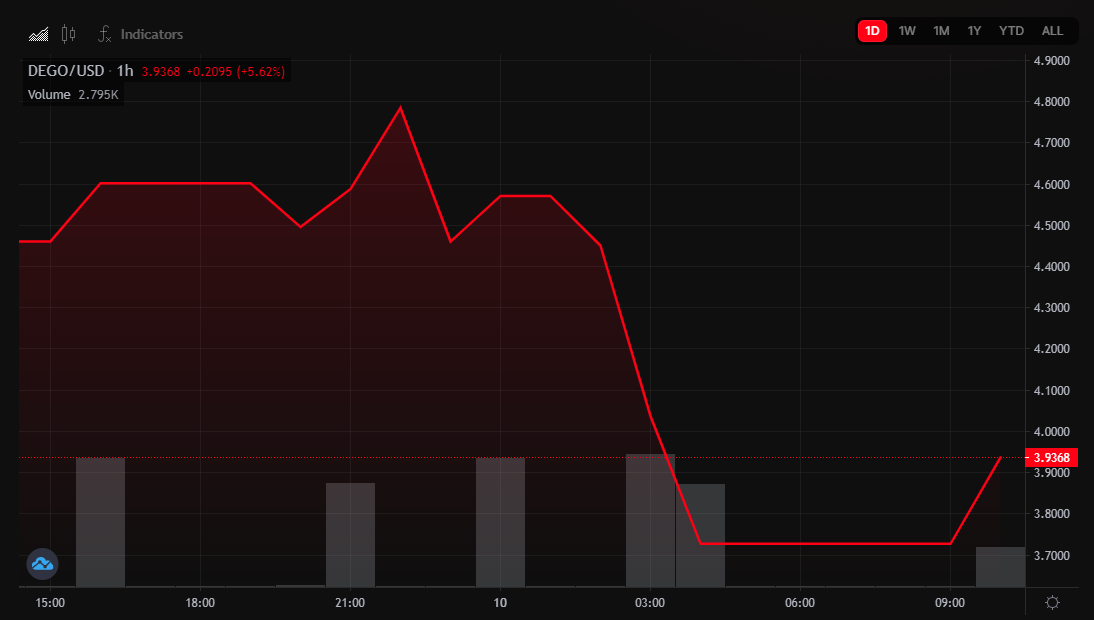 Вскоре после анонса цена токена DEGO обвалилась на 20% до $3,6. Рыночная капитализация сократилась до $35,5 млн. На момент написания материала цена DEGO составляет $3,9, согласно данным Nomics.