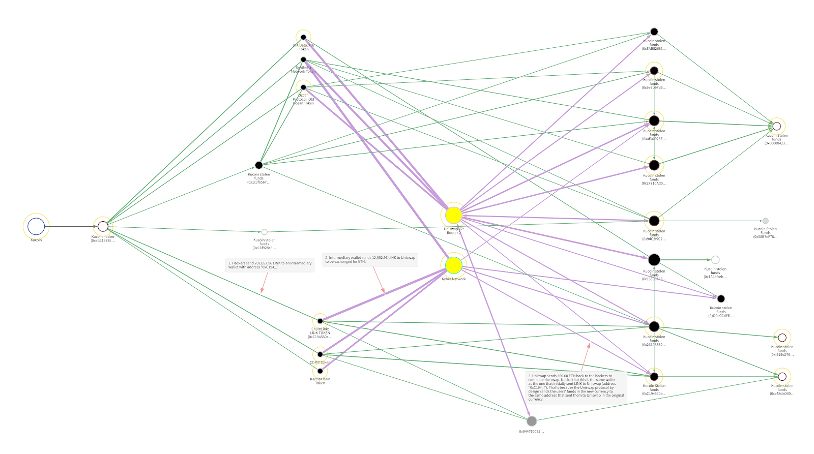Сначала взломщики биржи переместили более 200 тыс. LINK на кошелек-посредник с адресом «0xC194…». Затем посреднический кошелек отправляет 12 552 LINK на Kyber Network, который конвертирует токены LINK с помощью Uniswap на 360 ETH.