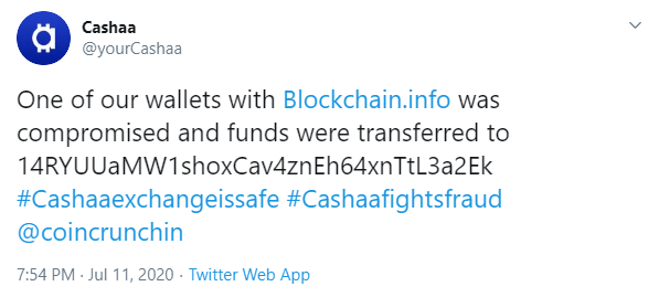Как сообщают представители криптовалютной биржи Cashaa, хакер или группа хакеров заразили компьютеры биржи вредоносным ПО, которое и выдало коды доступа к кошелькам компании. По сообщениям организации, кошелек Blockchain.com, на котором хранились средства биржи, был взломан с помощью удаленной атаки и 336 ВТС были выведены на неизвестный адрес, предположительно зарегистрированный в Дели, Индия. Служба безопасности биржи сообщила, что было осуществлено две транзакции, и все деньги, находящиеся в кошельке, были утеряны.