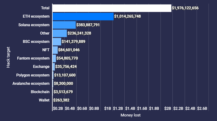 Рынок криптовалют понес потери размером почти в $2 млрд из-за взломов проектов за одно только первое полугодие 2022 года. К такому выводу пришли исследователи Atlas VPN. По подсчетам аналитиков, с начала года злоумышленники обчистили 175 проектов на общую сумму в $1,97 млрд.