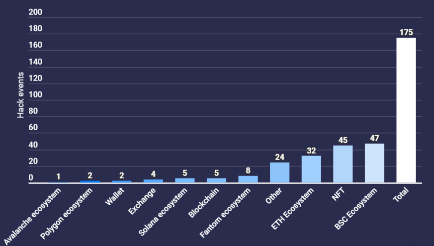 Взломы NFT-коллекций принесли злоумышленникам суммарно $84,6 млн. Остальные криптовалютные проекты, пострадавшие от киберпреступников в первой половине 2022 года, включают криптовалютные биржи ($35,8 млн), экосистему Polygon ($13,1 млн) и другие.