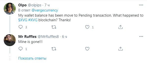 Многие пользователи Twitter пожаловались на то, что балансы кошельков были переведены в режим ожидания перевода транзакции, а некоторые клиенты Verge сообщили, что их баланс пропал вовсе.
