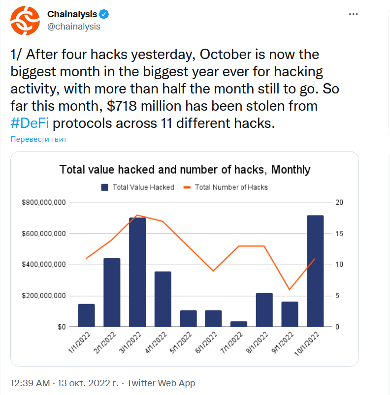 Эксперты Chainalysis опубликовали твит, в котором сообщили, что за первую половину октября в результате взломов и эксплойтов злоумышленники похитили из 11-ти DeFi-протоколов денег на общую сумму порядка $718 млн.
